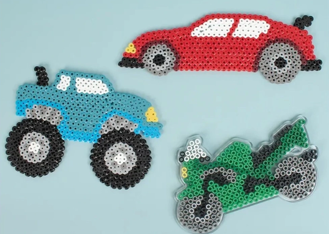 Průhledné podložky PLAYBOX pro zažehlovací korálky o průměru 5 mm usnadní tvoření motivů aut i dalších obrázků. Jsou odolné, opakovaně použitelné a díky průhlednému provedení umožňují snadnou práci se šablonami doma, ve škole i v kroužcích.