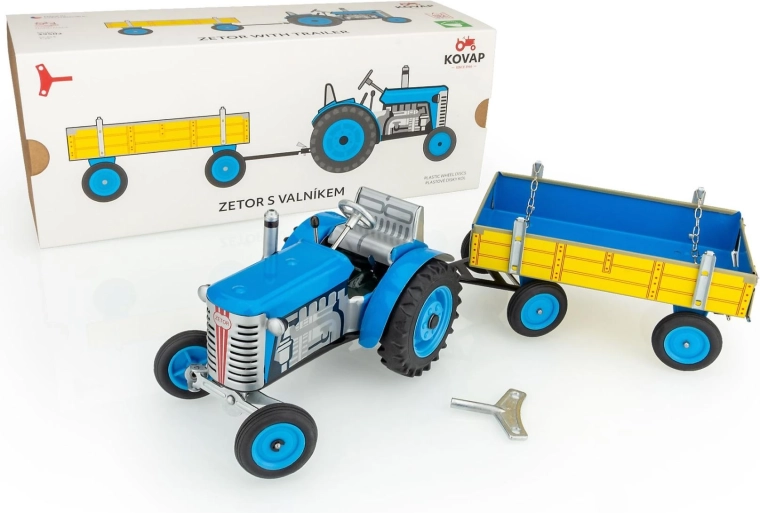 Tento precizně zpracovaný kovový traktor ZETOR s valníkem od české značky KOVAP funguje na klasický natahovací klíček. Díky skutečné převodovce a ruční brzdě nabízí realistické ovládání a hodiny zábavy. Ideální pro děti od 3 let i pro sběratele tradičních plechových hraček.