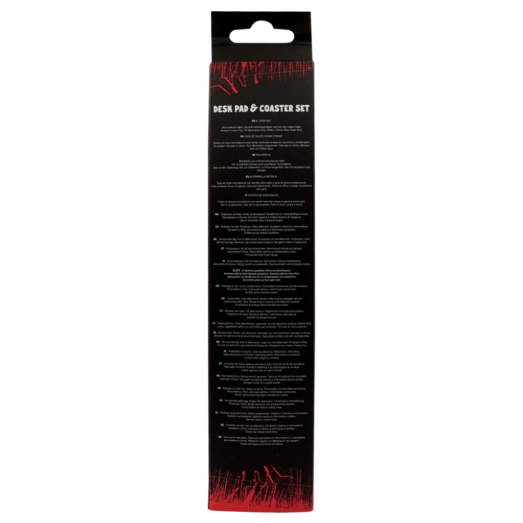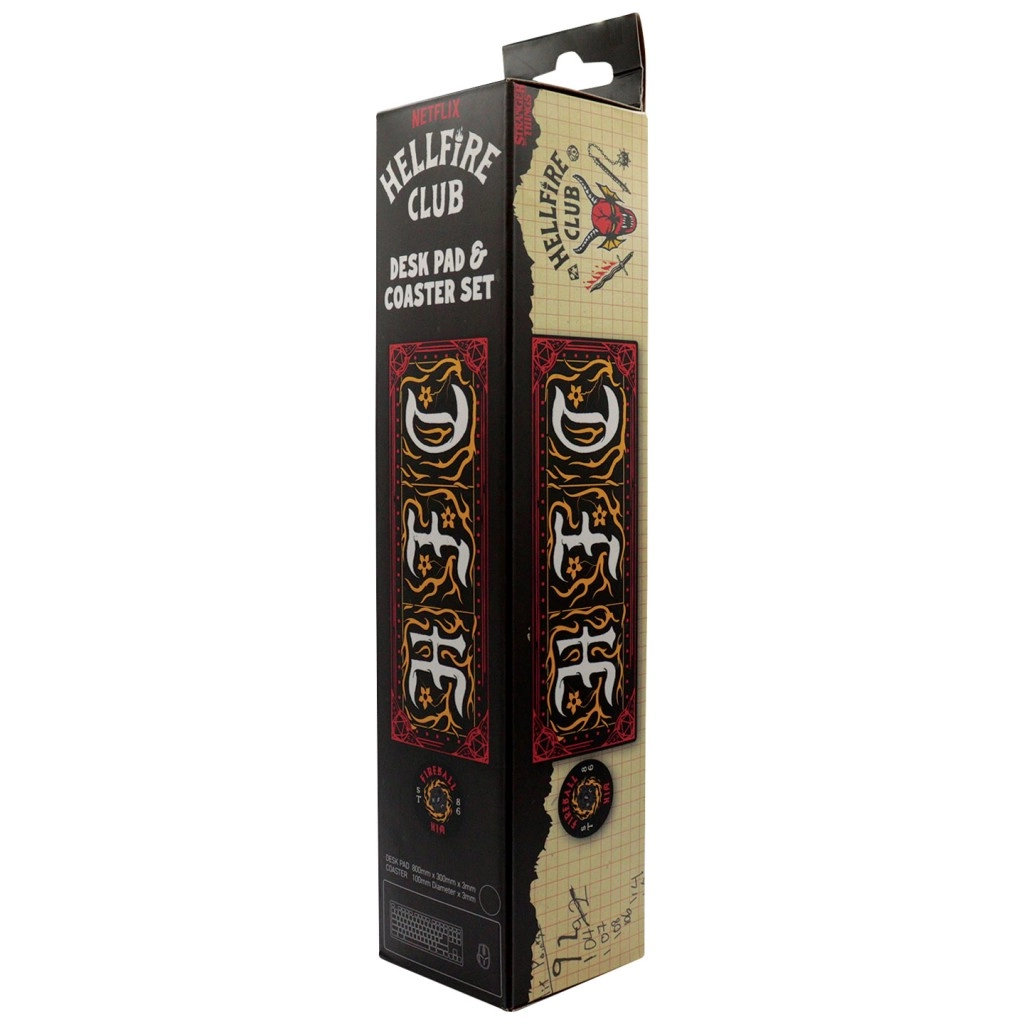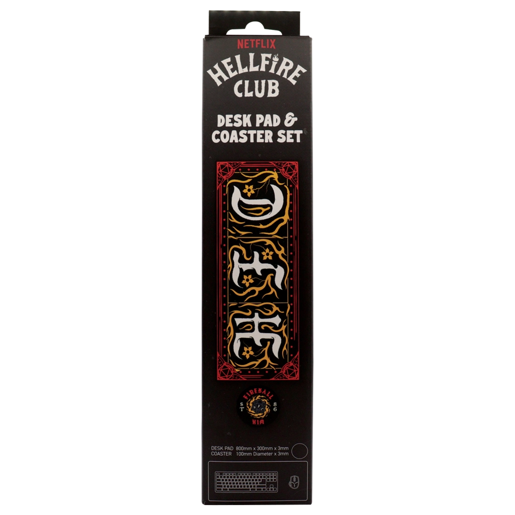 Vylaďte svůj herní nebo pracovní kout ikonickým setem STRANGER THINGS Hellfire Club. Obdélníková stolní podložka poskytuje měkký, ale odolný povrch pro myš, klávesnici i příslušenství a zároveň chrání stůl před poškrábáním. Kulatý podtácek ve stejném motivu udrží nápoje po ruce bez zanechání kroužků.