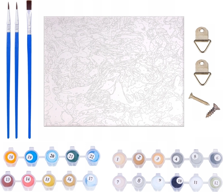 V balení najdete vše, co potřebujete: kvalitní akrylové barvy, tři nylonové štětce různých velikostí a očka pro snadné zavěšení. Akryly mají syté odstíny a dobrou kryvost, takže motiv Zimní krajina vynikne v detailu i hloubce.