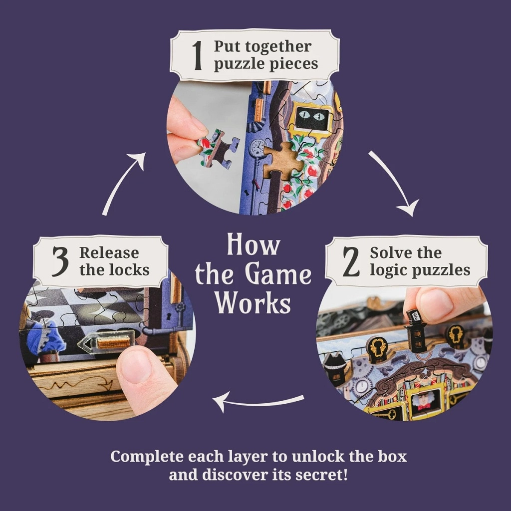 Originální koncept spojuje skládání ilustrovaných scén se skrytými indiciemi a mechanikou únikové hry. Každý krok vás dovede blíž k odemčení tajemné schránky.