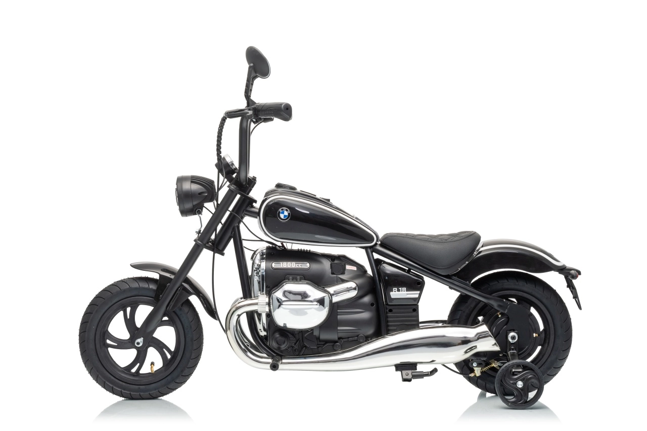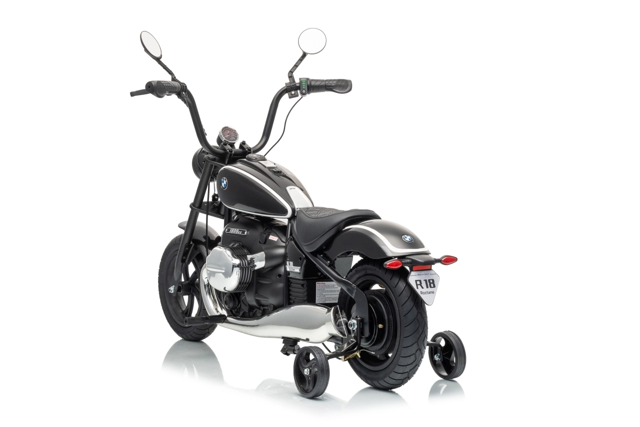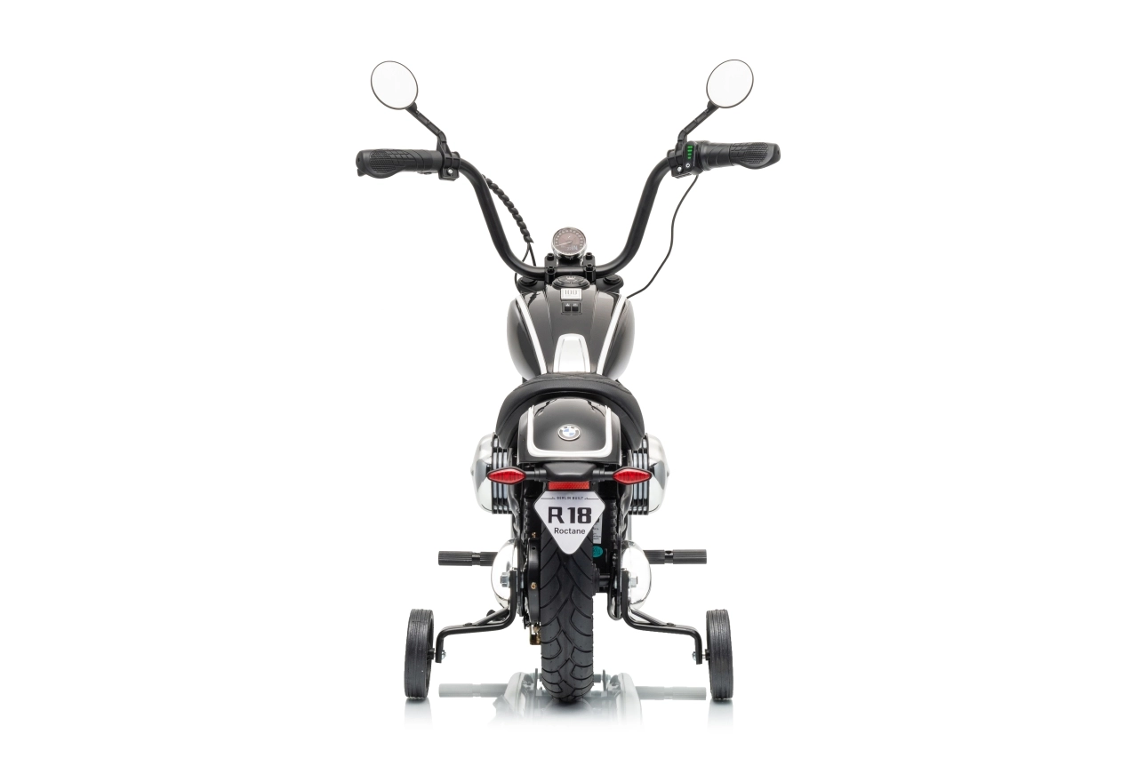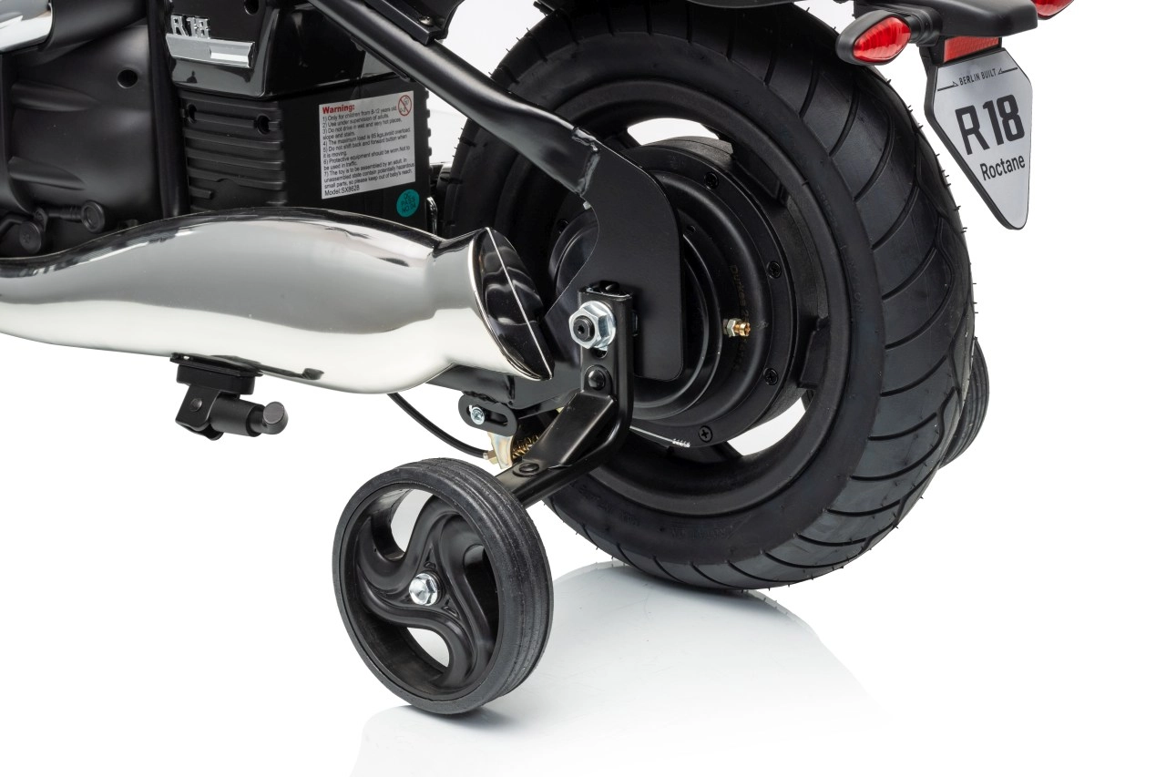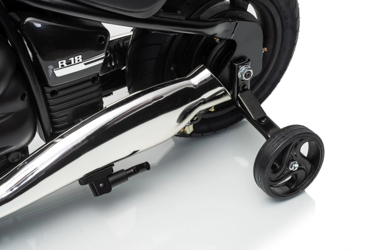 Stylová dětská elektrická motorka inspirovaná modelem BMW R18 nadchne realistickým vzhledem a pohodlnou jízdou. Silný bezkomutátorový motor 200 W, baterie 24 V 7 Ah a nafukovací kola 31 × 7 cm zajistí plynulý rozjezd, dobrou trakci a dlouhou zábavu. Pro bezpečnost slouží boční stabilizační kolečka, přehledné LED osvětlení a pomalejší start. Zábavu doplní audio panel s MP3, Bluetooth, klaksonem a melodiemi.