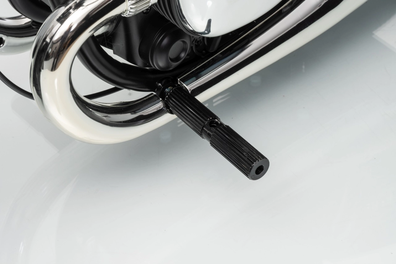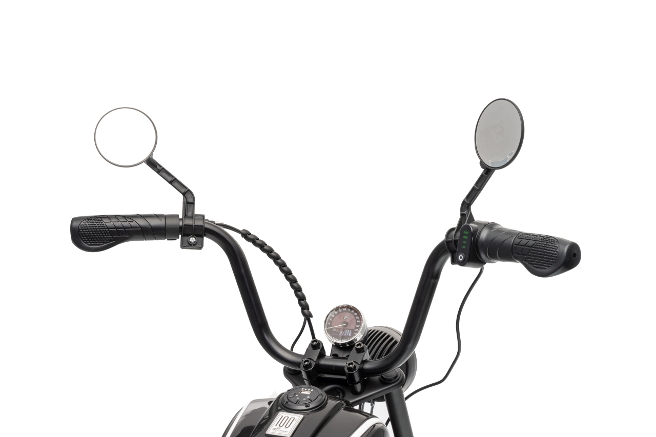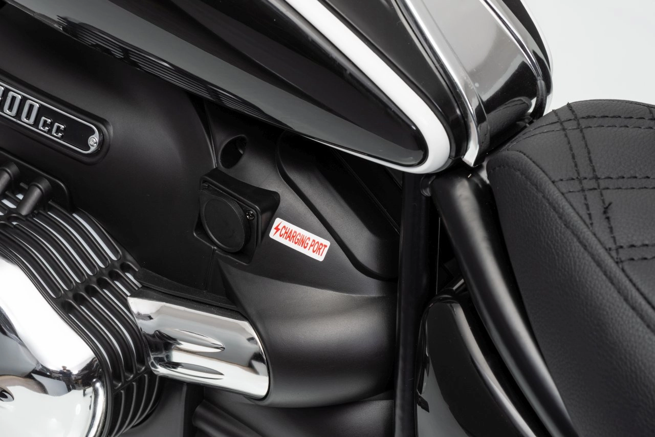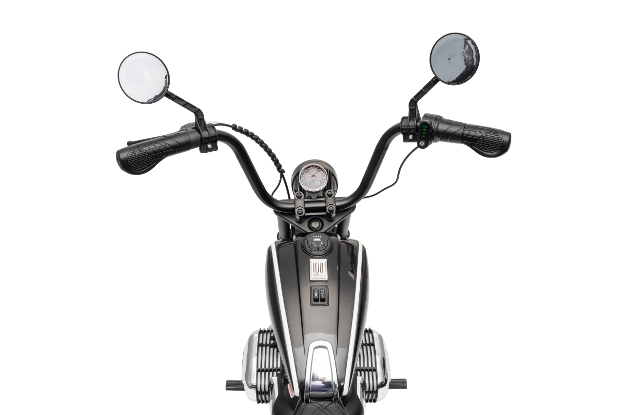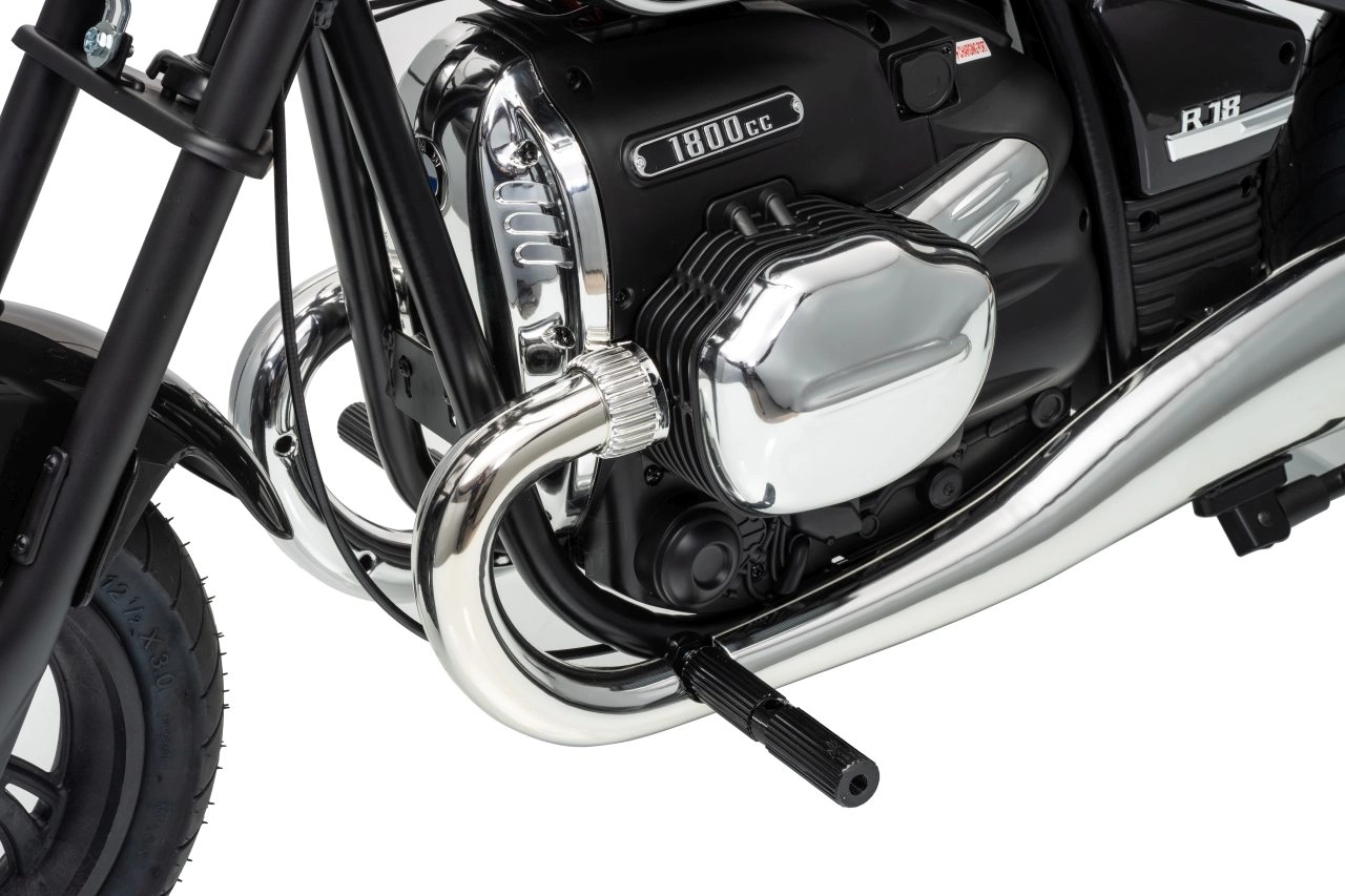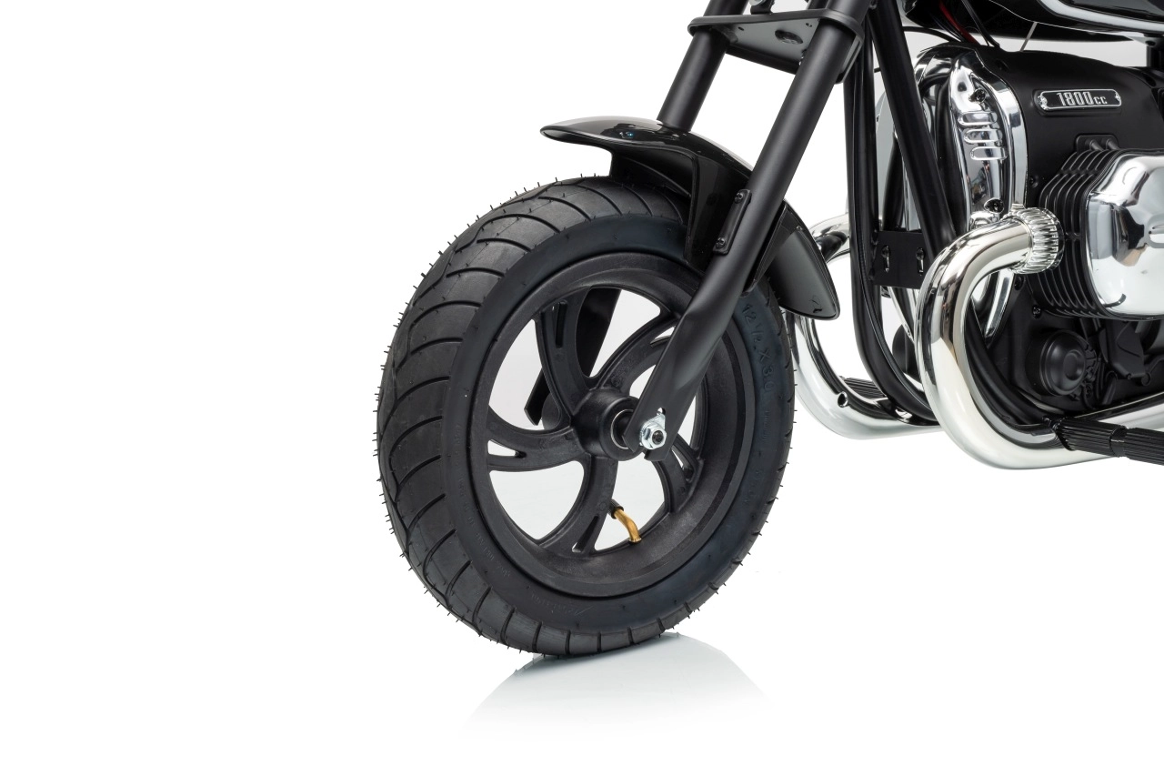 Stylová dětská elektrická motorka inspirovaná modelem BMW R18 nadchne realistickým vzhledem a pohodlnou jízdou. Silný bezkomutátorový motor 200 W, baterie 24 V 7 Ah a nafukovací kola 31 × 7 cm zajistí plynulý rozjezd, dobrou trakci a dlouhou zábavu. Pro bezpečnost slouží boční stabilizační kolečka, přehledné LED osvětlení a pomalejší start. Zábavu doplní audio panel s MP3, Bluetooth, klaksonem a melodiemi.