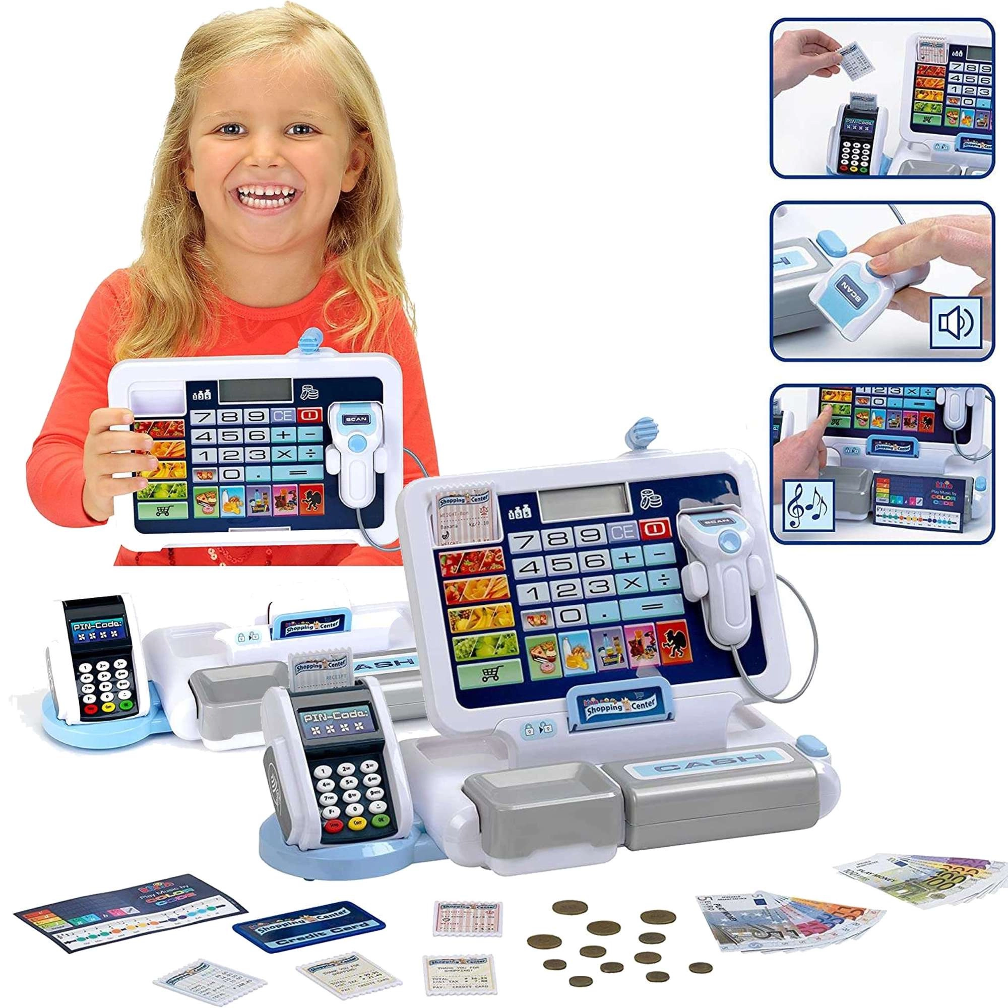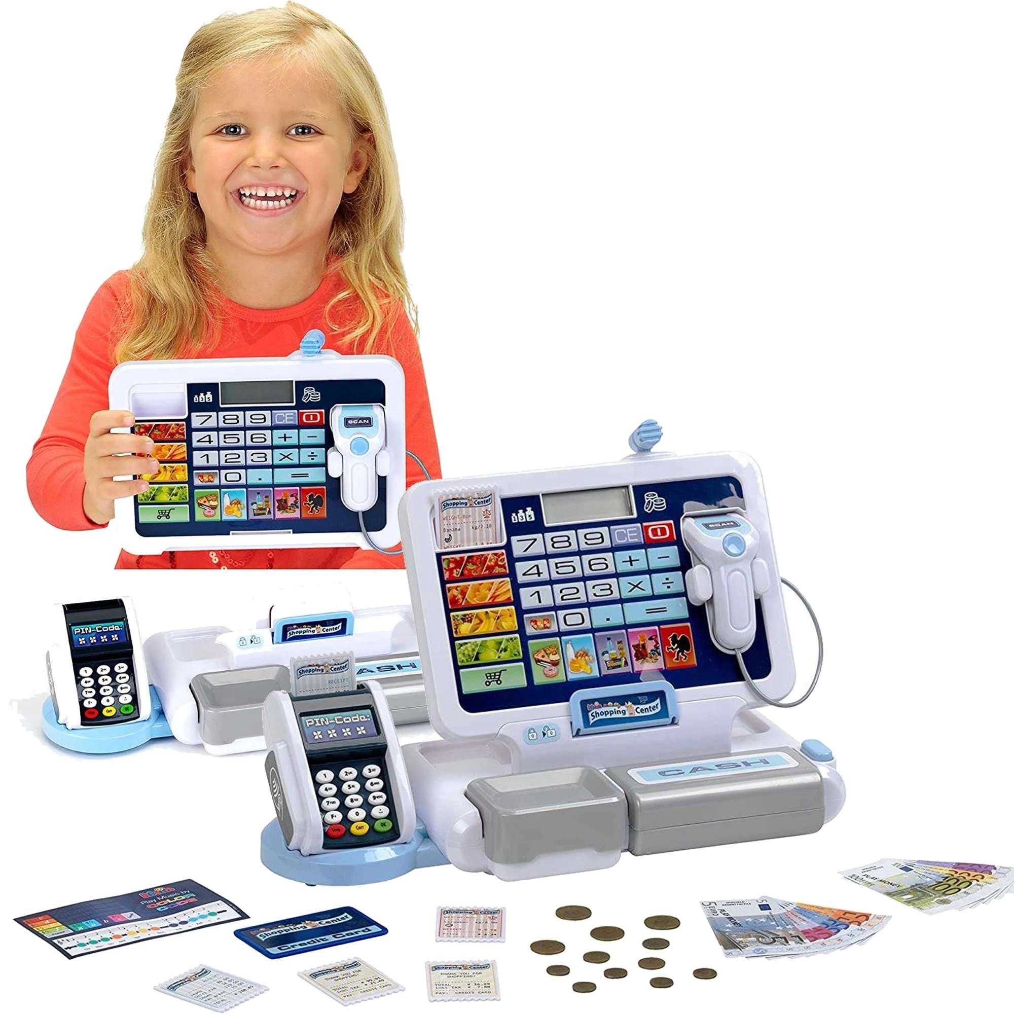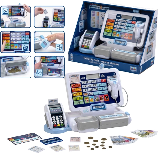 Realistická dětská pokladna s terminálem a skenerem od značky KLEIN přináší autentickou hru na obchod. Nabízí funkční displej s kalkulačkou, otevíratelný šuplík na peníze, čtečku karet, zvukové efekty a bohaté příslušenství včetně euromincí a bankovek, účtenek i „kreditní“ karty – ideální pro rozvoj počítání, finanční gramotnosti a rolové hry.