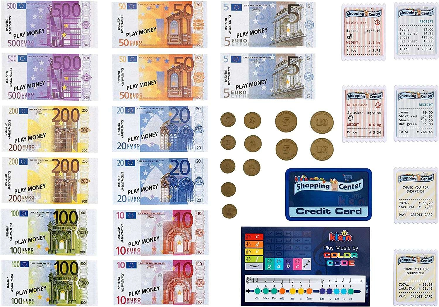 Sada obsahuje kartonové mince, papírové bankovky, několik účtenek, platební kartu a kartičku s písničkami – vše pro kompletní hru na obchod.