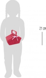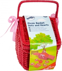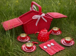 Okouzlující piknikový koš s motivy puntíků a srdíček ukrývá plechovou čajovou soupravu připravenou na každý imaginární čajový dýchánek. Pevné provedení s nastavitelnými pásky na suchý zip a textilním lemem zajišťuje snadné přenášení i ukládání všech dílů. Děti si procvičí společenskou interakci, motoriku i kreativitu.
