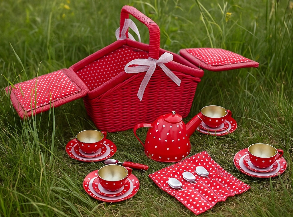 Vše potřebné v jednom koši: konvice, podnos na příbory, 4 velké a 4 malé talíře, 4 šálky a 4 lžičky – připraveno k okamžité hře.