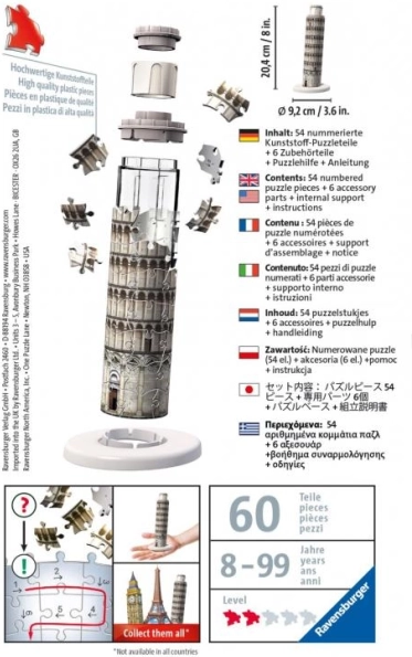 Tento 3D puzzle je ideální pro kluky i holky, pomáhá s rozvojem jejich řešitelských dovedností a zlepšuje jejich trpělivost a pozornost k detailům. Puzzle je navrženo s precizností a kvalitou a zachycuje ikonický architektonický zázrak Šikmé věže v Pise ve strhující 3D. Skládání jednotlivých dílků dohromady pro rekonstrukci tohoto slavného orientačního bodu poskytuje smysl pro úspěch a přináší náhled na architektonické divy světa. Ať už jako samostatná činnost, nebo jako zážitek pro celou rodinu a přátele, toto puzzle přinese hodiny zábavy a kousek bohaté italské historie a krásy do vašeho domova.