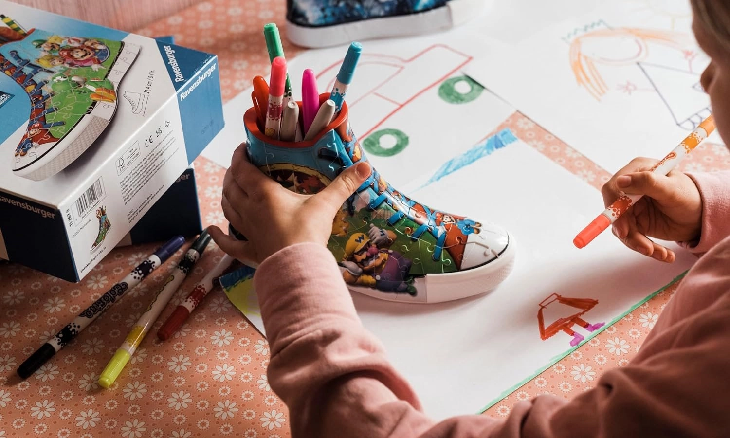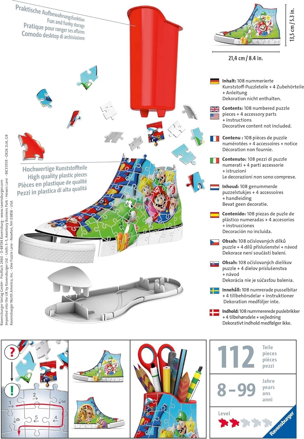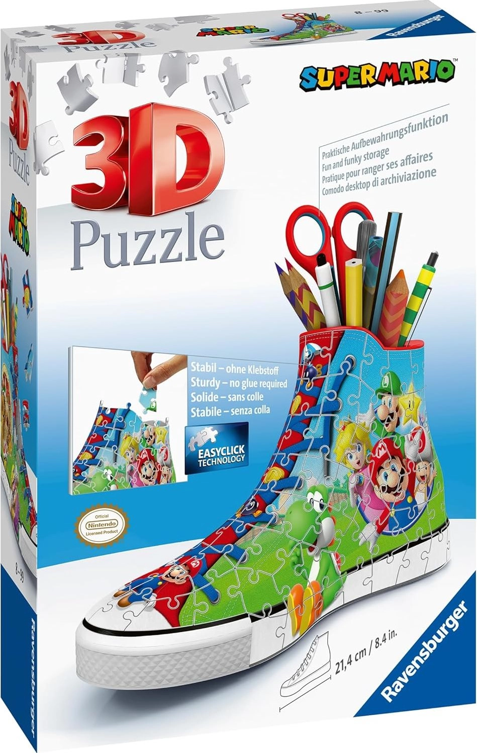Tento originální 3D puzzle ve tvaru tenisky kombinuje svět SUPER MARIO s chytrou funkčností. Po sestavení získáte pevný a dekorativní stojánek na psací potřeby, který rozzáří dětský stůl a zároveň udrží pořádek. Díky přesnému zpracování dílků Ravensburger je skládání plynulé a zábavné.