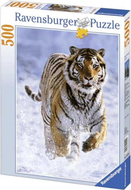 Puzzle zobrazuje nádherný obraz tygra v pohybu na sněhu, který upoutá svými kontrastními barvami.