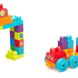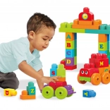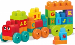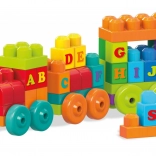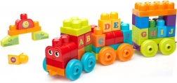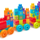 Tento barevný vzdělávací set umožňuje spojit tři podvozky na kolečkách do vláčku a skládat na ně kostky s písmeny. Děti se tak hravou formou učí abecedu, vytvářejí první slova a procvičují koordinaci oko–ruka.