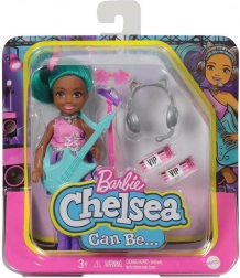 Panenka Chelsea jako rocková hvězda s tyrkysovou kytarou a stříbrnými sluchátky je připravena na hudební dobrodružství.