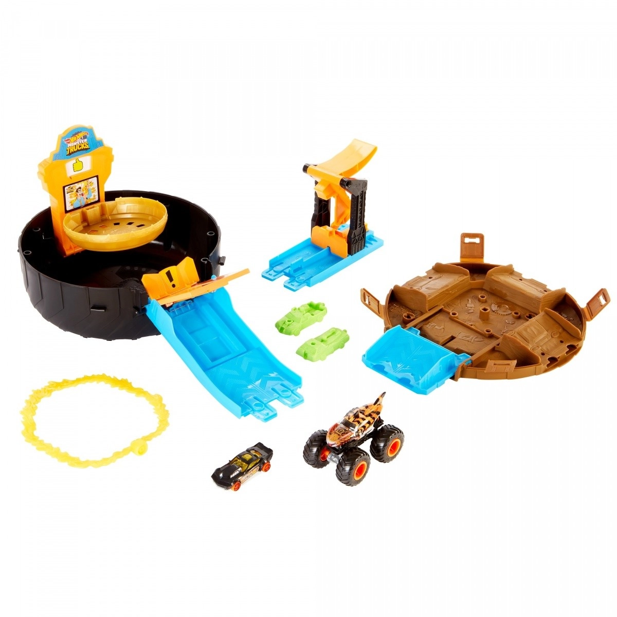 Přenosná kaskadérská aréna v tvaru obří pneumatiky od Hot Wheels Monster Trucks přináší epické skoky, nárazy a soutěžení kdekoli. Set se po rozložení měří cca 89 cm, obsahuje vystřelovač pro 2 autíčka nebo 1 monster truck, ohnivý kruh, skóre tabuli a platformu vítězů. Součástí je Monster Truck Tiger Shark a autíčko Hot Wheels 1:64.