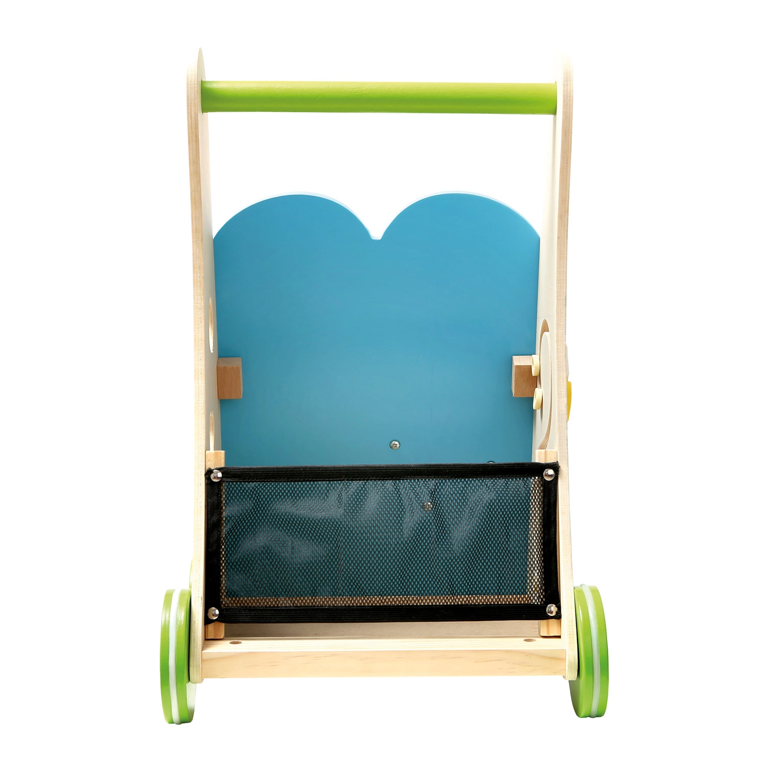 Toto multifunkční dřevěné chodítko pomáhá dětem trénovat rovnováhu, koordinaci i jemnou motoriku. Přední panel je plný aktivit: hudební xylofon s paličkou, ozubená soukolí, korálkový labyrint a vkládačka, které podporují soustředění a logické myšlení.