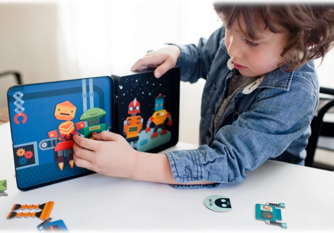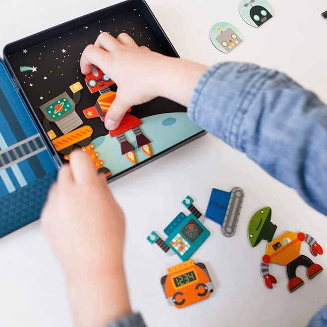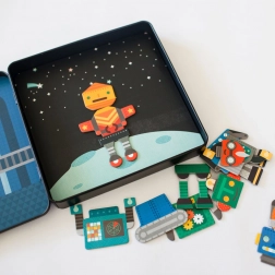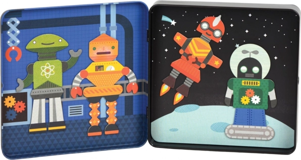 Magnetická sada s roboty je skvělá zábava pro děti od 3 let. Díky více než 25 magnetickým dílkům mohou malí konstruktéři skládat nekonečné kombinace robotických postav a rozvíjet tak fantazii i tvořivost. Plechová krabička se pevně uzavírá a uvnitř ukrývá dvě barevné scény, na které lze dílky snadno přichytit.