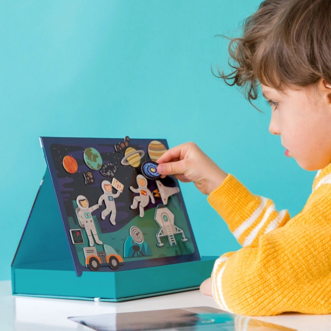 Magnetické divadlo vesmír přináší dětem nekonečné možnosti kombinací a scén na dvou magnetických pozadích – ve vesmíru a na vesmírné stanici. Díky více než 50 magnetickým dílkům mohou malí průzkumníci vytvářet originální příběhy, rozvíjet fantazii a jemnou motoriku. Praktická krabice se stojánkem a zarážkami umožňuje snadné postavení scény kdekoli.