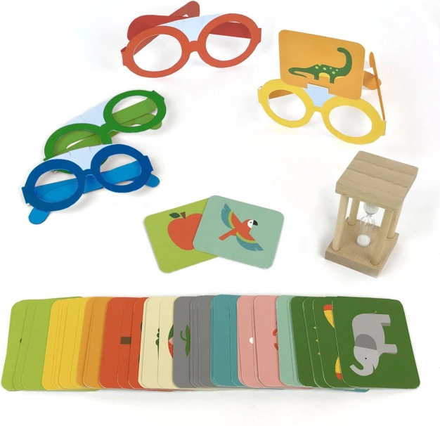 V balení najdete vše, co potřebujete: 4 nastavitelné brýle s držákem karet, 50 pevnych karet s roztomilými ilustracemi a přesýpací hodiny pro tempo hry. Kvalitní zpracování z recyklovaného papíru a tisk rostlinnými inkousty splňuje všechny bezpečnostní normy.