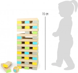 Hra obsahuje 60 barevně rozlišených bloků a kostku, která činí hru ještě zábavnější. Sestav věž co nejvyšší, aniž by spadla! Věž může dosahovat až do výšky 100 cm, což přidává na vzrušení z každého tahu.