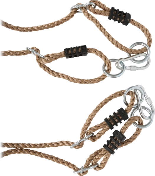 Nylonová lana s kovovými průvleky, kroužky a bezpečnostními karabinami zajistí rychlé, pevné a bezpečné zavěšení.