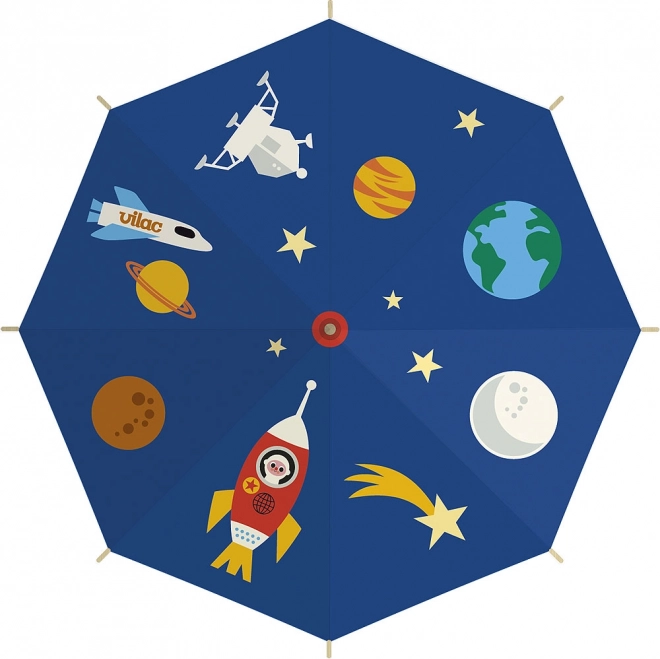 Objevte kouzlo deštivých dnů s dětským deštníkem VILAC Kosmonaut. Barevný vesmírný potisk s planetami a raketami promění cestu do školky či školy v zábavu, zatímco robustní konstrukce spolehlivě ochrání před deštěm. Ergonomická dřevěná rukojeť se dětem dobře drží a podporuje jistý úchop.