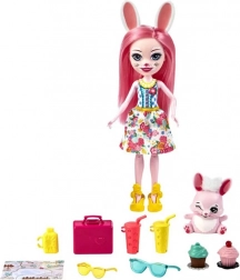 Panenka Bree s dlouhými růžovými vlasy a králičími ušima je připravena na cestu. Její outfit zahrnuje letní šaty s květinovým potiskem, boty a sluneční brýle.