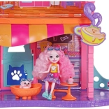 Objevte velkoměstské dobrodružství s domkem ENCHANTIMALS, který přináší až 6 herních zón v jednom stylovém setu. Děti mohou obsluhovat hosty v útulné kavárně s patio, relaxovat v obýváku s kuchyní, uložit panenku do ložnice a užít si zábavu v bazénu na střeše. Realistické prvky jako balkon, požární schodiště a otevírací dveře s klapkou pro pejska Pommy podporují role-play a rozvoj fantazie.