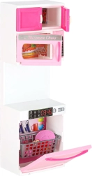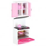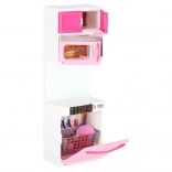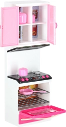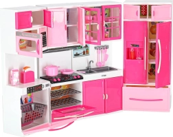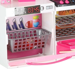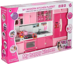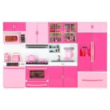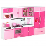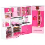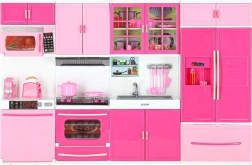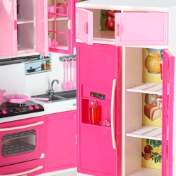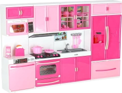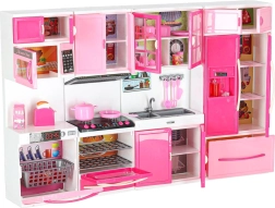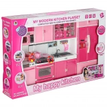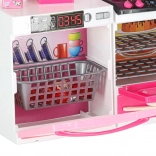 Sestava zahrnuje mikrovlnku a myčku, sporák s troubou, vitrínu se dřezem i lednici se zásuvkou. Děti si užijí kompletní scénář vaření, pečení i uklízení.