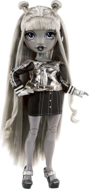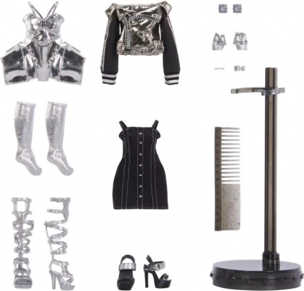 Součástí je stylový outfit v odstínech šedé, černé a stříbrné, doplněný botami, šperky a stojánkem. Bohatá sada doplňků podporuje nápaditou hru, mixování stylů i sběratelské vystavení. Vstupte do rivality škol RAINBOW HIGH a SHADOW HIGH a tvořte vlastní módní scénáře.