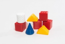 Tato didaktická sada kostek je ideální volbou pro první stavění. Díky čtyřem tvarům a barvám děti poznávají barvy, tvary a učí se koordinaci ruka–oko. Kostky jsou lehké, bezpečné a příjemné do ručky.