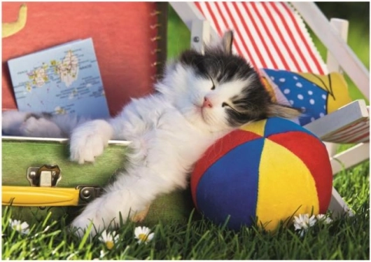 Barevný obrázek spícího koťátka s míčem motivuje děti ke skládání a zdobí každý dětský pokoj.