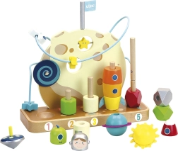 Tato hvězdná dřevěná hračka od Vilac zavede děti do mezigalaktického světa, kde mohou skládat planety, počítat a posouvat hvězdy po drátku. Důmyslné prvky podporují rozvoj jemné motoriky, logického myšlení a barevného vnímání.