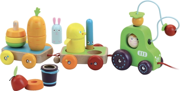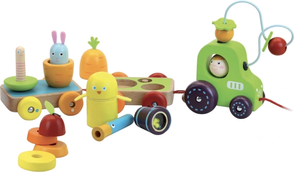 - Posuvné korálky: Traktor má korálky na drátku ve tvaru ovoce, které podporují motorické dovednosti.