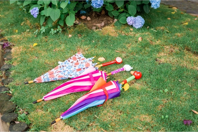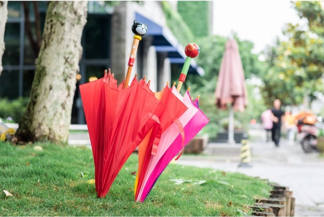 Deštník stojí na pevné kovové kostře, má ergonomickou dřevěnou rukojeť a lehce se otvírá i drží v malých ručkách. Díky průměru přibližně 75 cm poskytuje spolehlivé krytí před deštěm, aniž by překážel při chůzi.