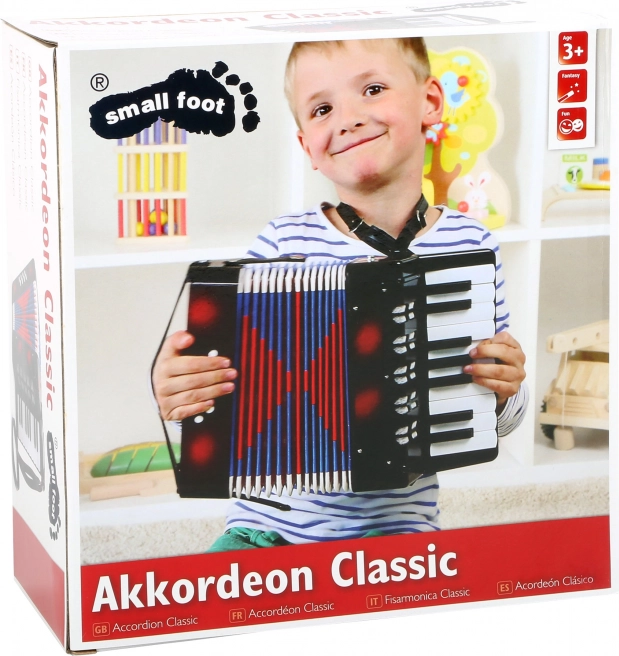 Objevte kouzlo hudby s dětskou harmonikou small foot Classic – ideální pro první hudební krůčky. Díky nastavitelným ramenním popruhům je hraní pohodlné a děti se mohou plně soustředit na rytmus a melodii. Leskle lakované provedení a více kláves podporují rozvoj jemné motoriky i kreativity. Nejedná se o hudební nástroj, ale o hračku.
