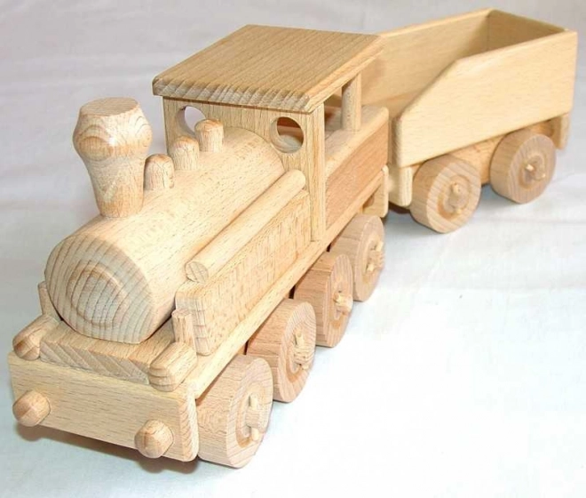 Tento dřevěný model parní lokomotivy zaujme precizním zpracováním bukového dřeva a přirozeným designem zvýrazněným pouze voskováním a leštěním. Lokomotiva má pohyblivá kolečka a je navržena bez ostrých hran, což zajišťuje bezpečné hraní pro děti. Díky tomu je vhodná nejen na hraní doma, ale také na pískovišti.