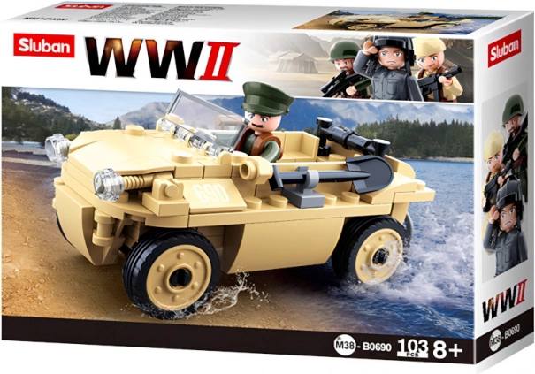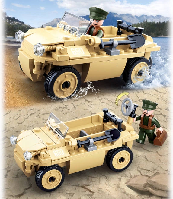 Stavebnice nabízí detailní repliku německého obojživelného vozu, obohacenou o realistické prvky jako čelní sklo a pohyblivá kola.