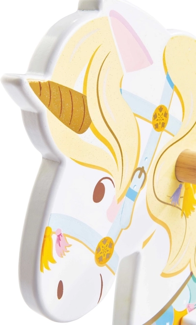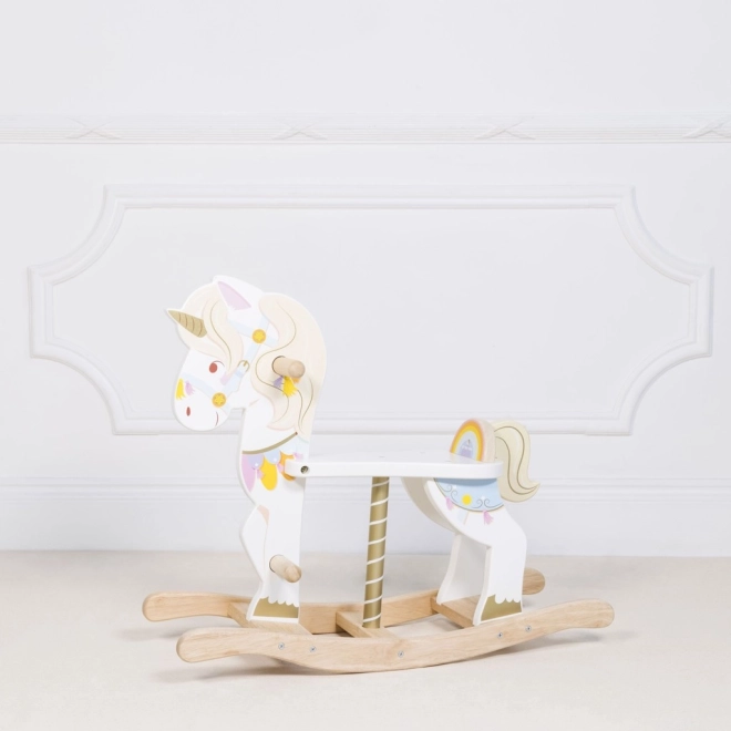 Houpací jednorožec LE TOY VAN z kolekce Petilou je klasická hračka v moderním pojetí. Díky pevnému dřevěnému základu a promyšlené ergonomii podporuje přirozené houpání, rozvíjí koordinaci, rovnováhu a jistotu v pohybu. Bohaté barevné detaily, zlatý roh a milý výraz podněcují fantazii i radost ze hry.