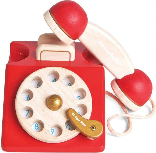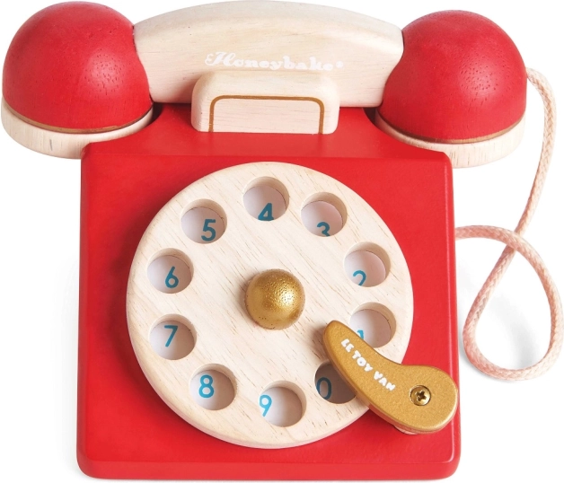 Objevte kouzlo klasického telefonu v dětském podání. Tento dřevěný retro telefon od LE TOY VAN z kolekce Honeybake zaujme sytě červeným provedením, přírodními detaily a realistickými prvky jako je otočný ciferník a zvonek ve sluchátku. Hračka je ručně domalována ekologickými barvami a navržena tak, aby dlouho vydržela.