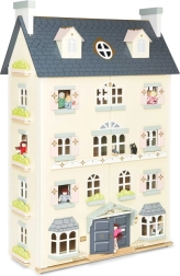Vstupte do světa královské fantazie s tímto luxusním dřevěným domečkem pro panenky od značky LE TOY VAN. Vysoký, pětiospodlažní palác v nadčasových neutrálních tónech se zlatými detaily a otevíracími dveřmi a okny nabízí osm elegantních pokojů, velkolepé schodiště a oddělitelnou střechu s půdou. Vyroben z udržitelných materiálů, malován netoxickými barvami a navržen pro dlouhotrvající, kreativní hru.