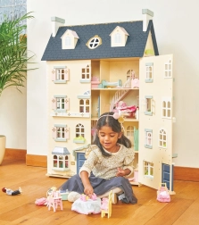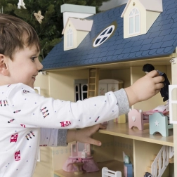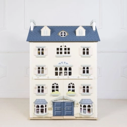 Palácový domeček pro panenky LE TOY VAN je výjimečná hračka a designový kousek v jednom. Na každé straně najdete množství oken, některá lze otevřít stejně jako nádherné vstupní dveře v královské modři. Osm stylových pokojů zdobí elegantní nástěnné dekorace a velké centrální schodiště sahající až do čtvrtého patra. Oddělitelná střecha odkrývá prostornou půdu přístupnou žebříkem – ideální na herní scénáře i jako úložný kout.