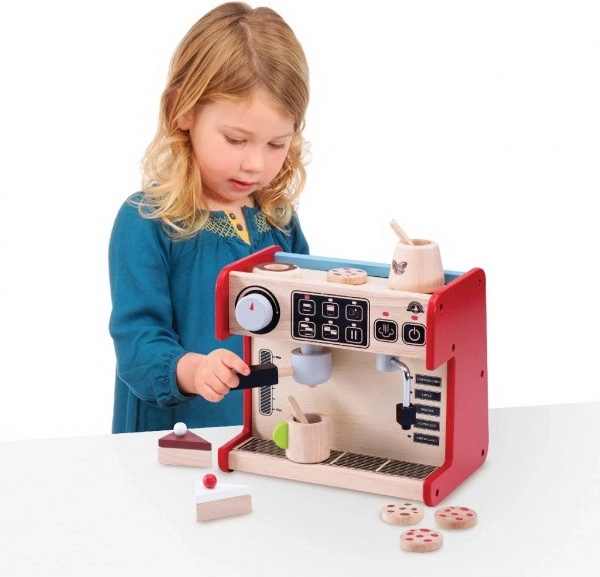 Děti si s tímto kávovarem mohou vyzkoušet, jaké to je být baristou. Souprava zahrnuje kávovar s odnímatelnou pákou a pohyblivým dávkovačem mléka. Vše je doplněno o ovládací displej s otočným cvakajícím knoflíkem a malovanými tlačítky.