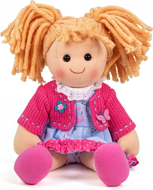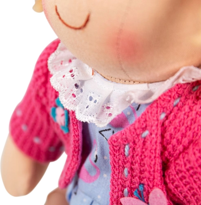 Látková panenka Maggie je roztomilá společnice pro každodenní hraní i mazlení. Díky měkkému tělíčku bez tvrdých částí je bezpečná už pro novorozence a její přátelský úsměv si děti zamilují na první pohled. Stylový outfit tvoří růžový pletený svetřík a modré šaty s motivem plameňáků, které podněcují představivost při rolových hrách.