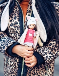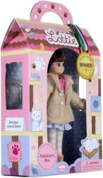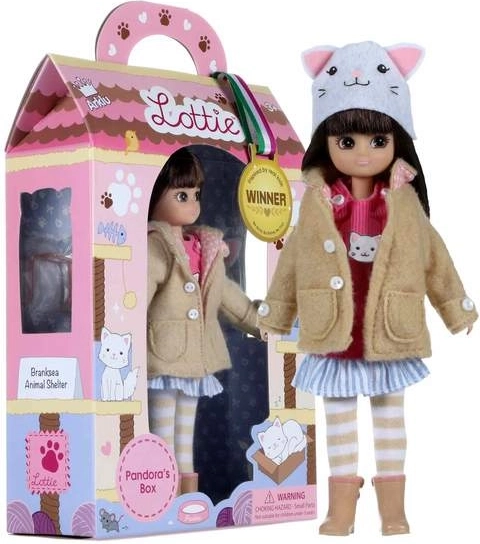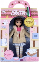 Panenka Lottie Pandorina skříňka je inspirována dobrodružstvím ve zvířecím útulku. Je oblečena v soupravě, která zaujme dětskou fantazii - béžový kabátek, růžový svetřík s motivem kočky, modro-bílá pruhovaná sukně, pruhované legíny a stylová čepice s ušima.