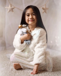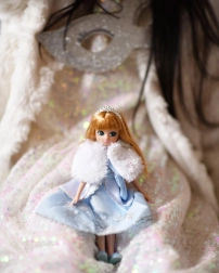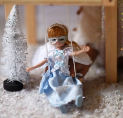 Panenka je oblečena v krásných modrých šatech s ledovými detaily a stříbrnými vločkami. Sní o kouzelném bálu jako Sněhová královna.