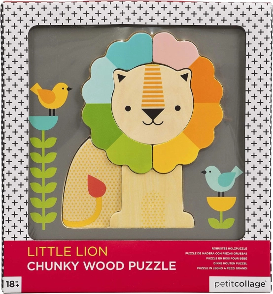 Postavte si přátelského lva s veselou duhovou hřívou s tímto dřevěným puzzlem od Petit Collage! Skvělé pro malé děti, díky pěti robustním dřevěným kouskům lze snadno vytvořit barevného lvího kamaráda.