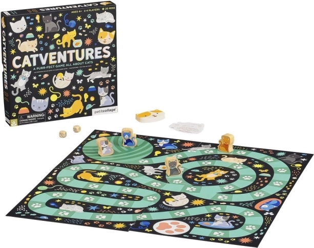Vyberte si svou kočičí figurku a vydejte se na hravé dobrodružství! Hra CATVENTURES od značky Petit Collage prověří vaše znalosti i kreativitu díky zábavným úkolům na kartičkách. Cílem je dorazit jako první na políčko s klubíčkem a cestou plnit výzvy podle hozené kostky.