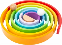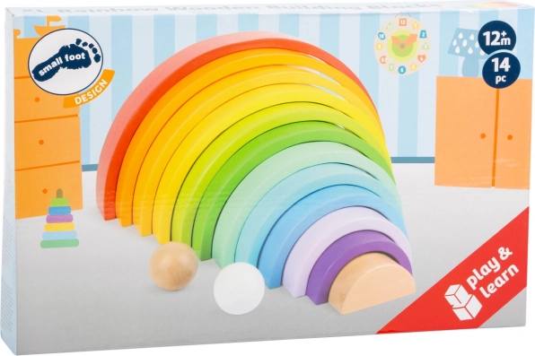 14 barevných oblouků lze skládat do duhy, mostů, tunelů i věží. Děti si trénují rovnováhu a představivost při každé nové kombinaci.