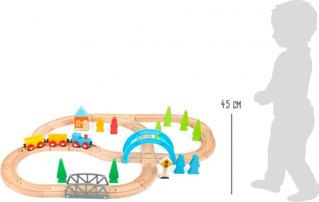 Souprava zahrnuje lokomotivu s vagónky, most, domeček, stromy, figurky a dopravní prvky pro realistické scénáře. Přirozené dřevo v kombinaci s výraznými barvami působí atraktivně a podporuje smyslové vnímání. Díky kompatibilitě s dalšími dřevěnými systémy mohou děti snadno rozšiřovat svět kolejí.