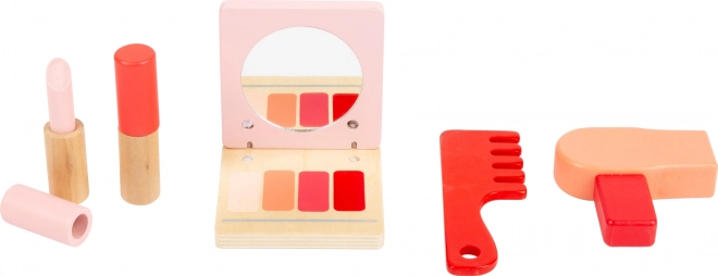 Zařiďte svým mladým parádnicím místo pro krásu a styl. Tento dřevěný kosmetický stolek nabízí vše, co děti potřebují pro hraní na kosmetiku. Součástí sady jsou malé dřevěné nástroje pro líčení a péči o vlasy, jako jsou rtěnky, malé oční stíny, hřeben a fén. Vše lze uklidit do šikovně rozdělené zásuvky.
