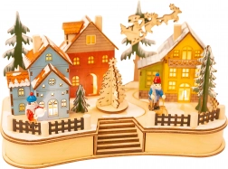 Tato pečlivě zpracovaná vánoční vesnice z dřeva vnese do každého interiéru útulné světlo a pohádkové kouzlo. Díky nepřímému podsvícení vyniknou detailní výřezy domků, stromků i zimních scén. Po zapnutí se navíc roztočí stromeček uprostřed vesnice, což dodá dekoraci živý, slavnostní efekt.